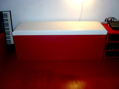 ●左右に自作チェストを敷き詰める。色はレッド、腰掛け部分はウレタンマットの上に白い合皮を打付ける